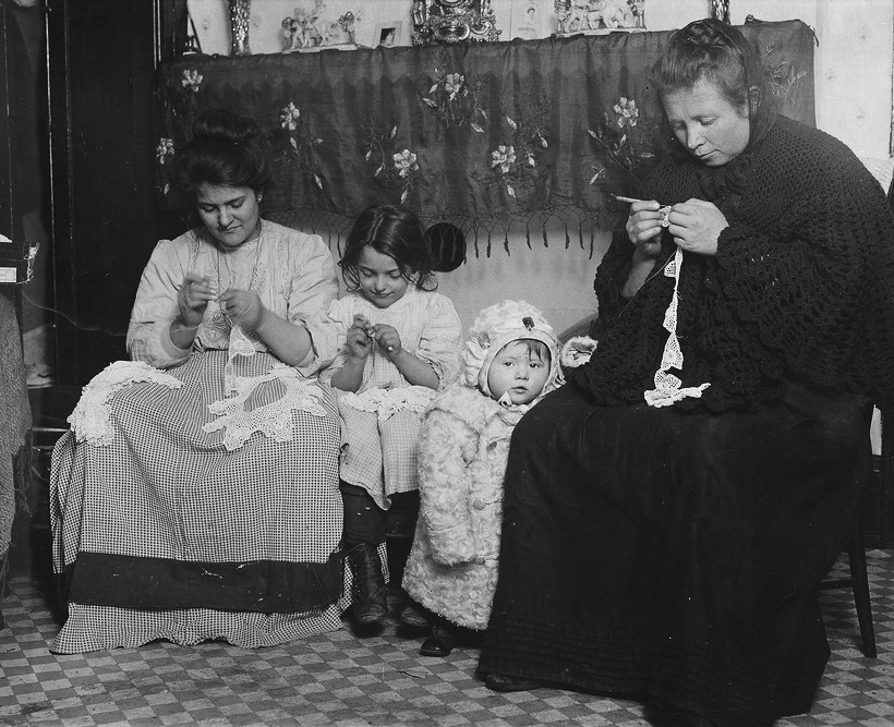 "Home Industry," A woman and her daughters do piecemeal sewing work at home, 1911 Credit: Lewis Hine, Library of Congress