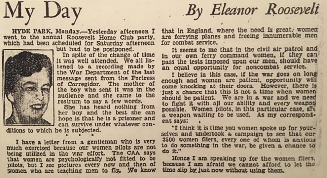 "The CAA says that women are psychologically not fitted to be pilots, but I see pictures every now and then of women who are teaching men to fly...I think it is time you women spoke up for yourselves and undertook a campaign to see that our 3500 women fliers, every one of whom is anxious to do something in the war, be given a chance to do it. Hence I am speaking up for the women fliers, because I am afraid we cannot afford to let the time slip by just now without using them." ~ Eleanor Roosevelt, in her syndicated news column, "My Day," September 1, 1942