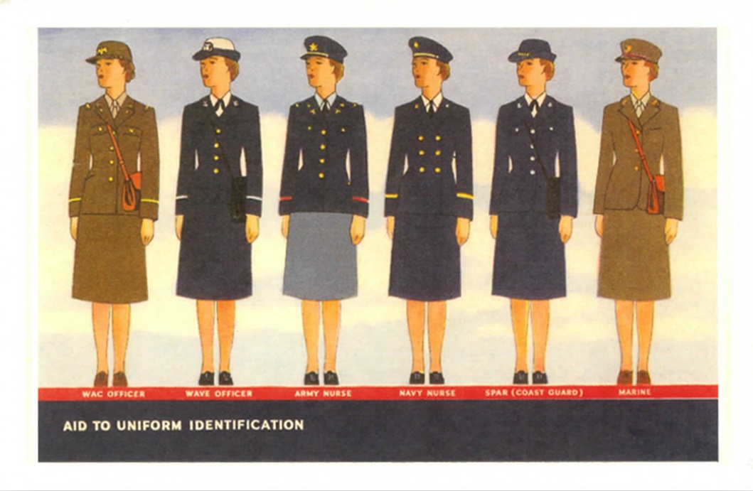 Postcard showing WAC, WAVE, Nursing, SPAR, and Marine Auxiliary Uniforms. Credit: Harvey, Fred