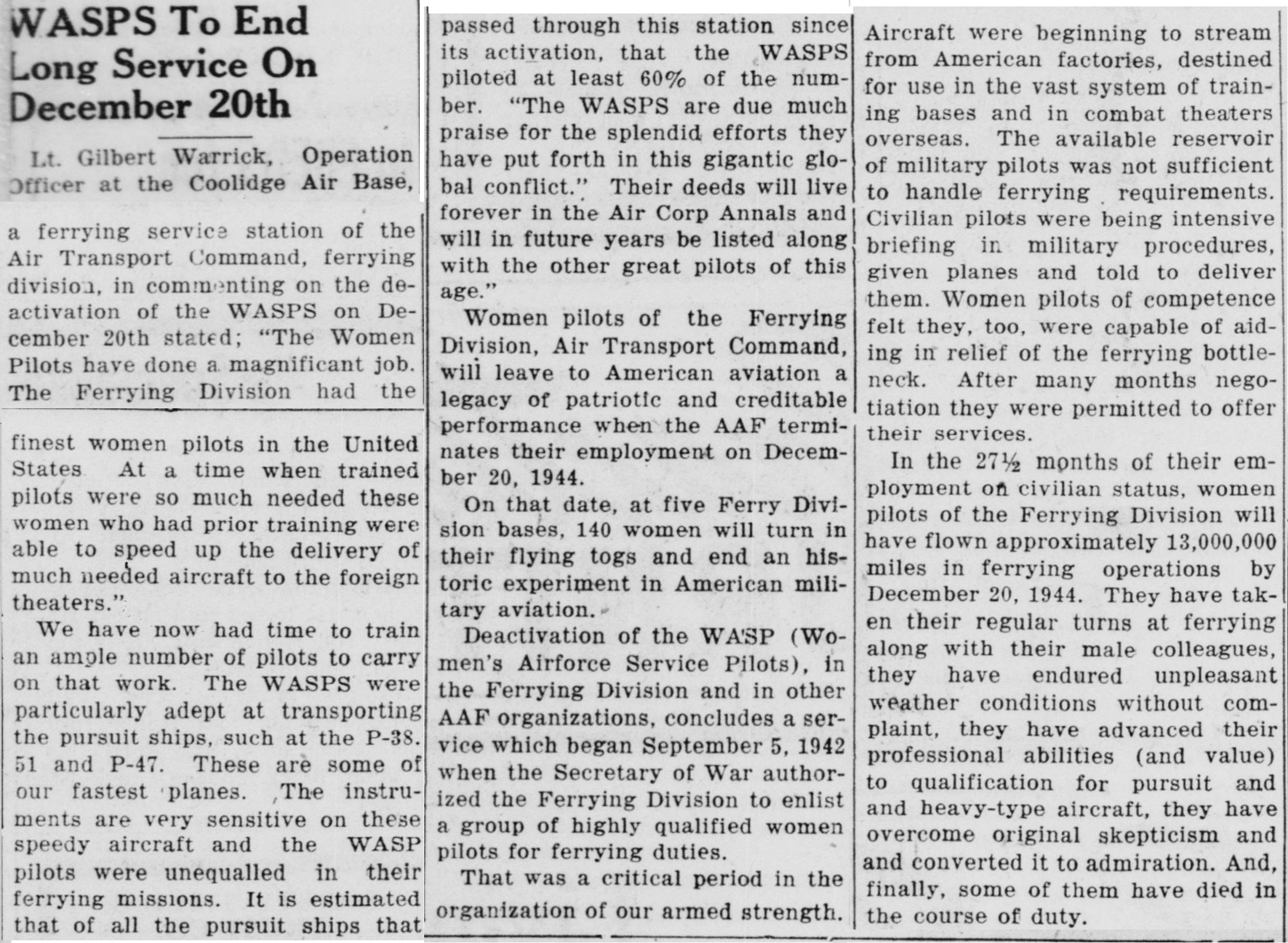 ~ "WASPS To End Long Service On December 20th." The Coolidge examiner. Coolidge, AZ. December 15. 1944.