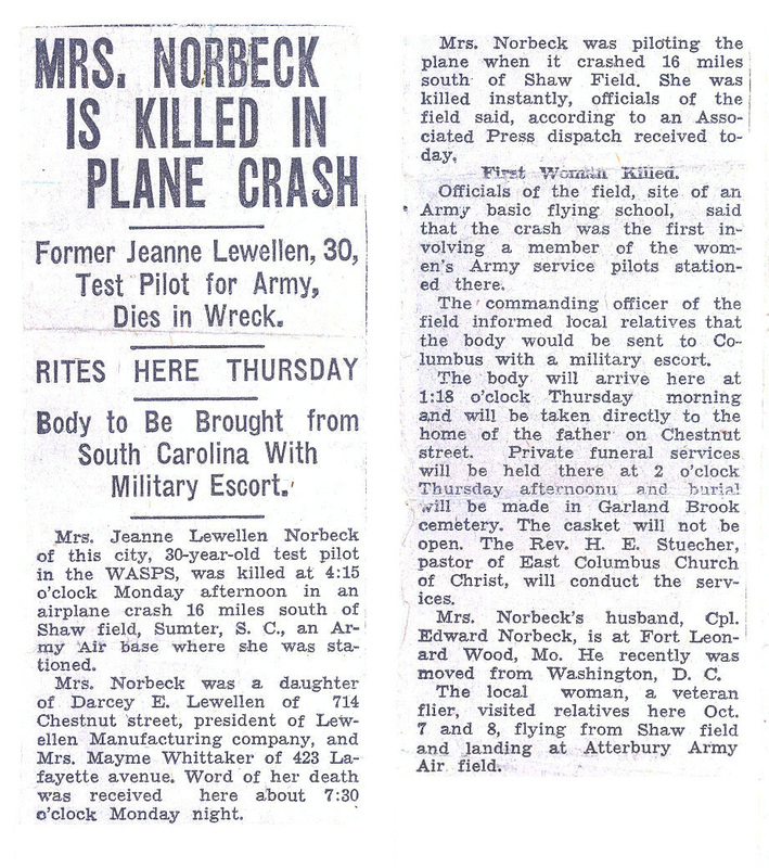 "Mrs. Norbeck is Killed in Plane Crash" Columbus Herald, Columbus IN, Oct. 18, 1944