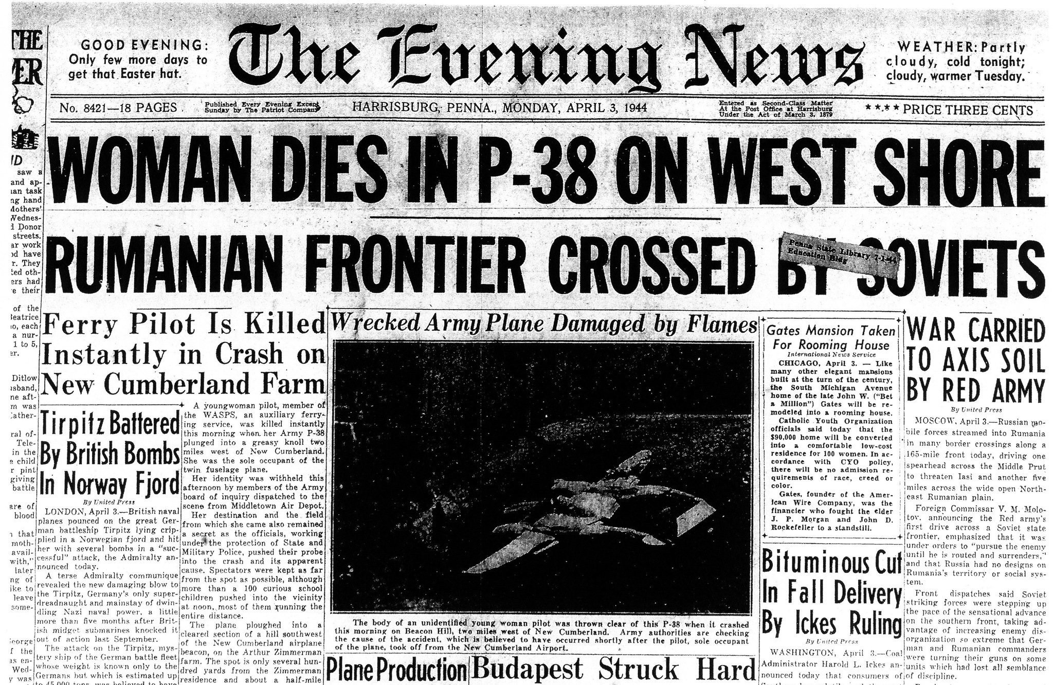 "Woman Dies in P-38 on West Shore" The Evening News, Harrisburg ,PA, April 3, 1944