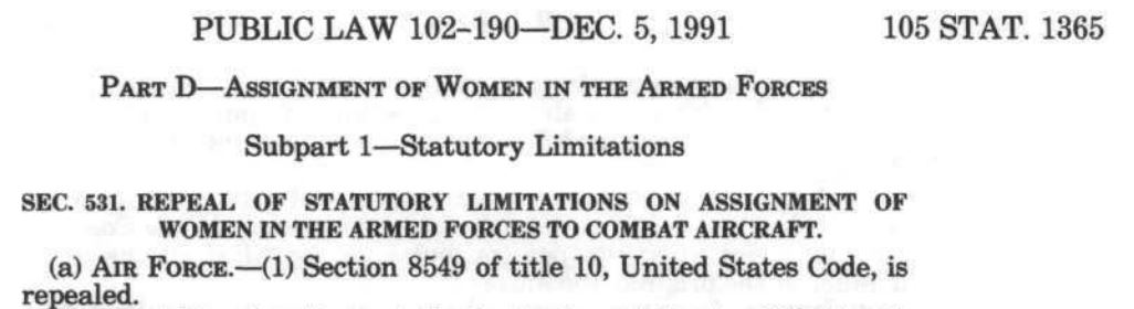 Public Law 102-190 repealed the ban on women flying in combat. Credit: United States Government Publishing Office
